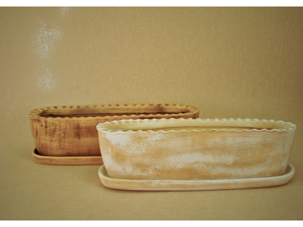 Design: Hladký, prostý design truhlíku s pod miskou, který vyniká svou jednoduchostí. K dispozici ve dvou šířkách: 52 cm a 32 cm, s hloubkou 17 cm. ( Průměr se může lišit přibližně o 1 cm v důsledku ruční výroby ).